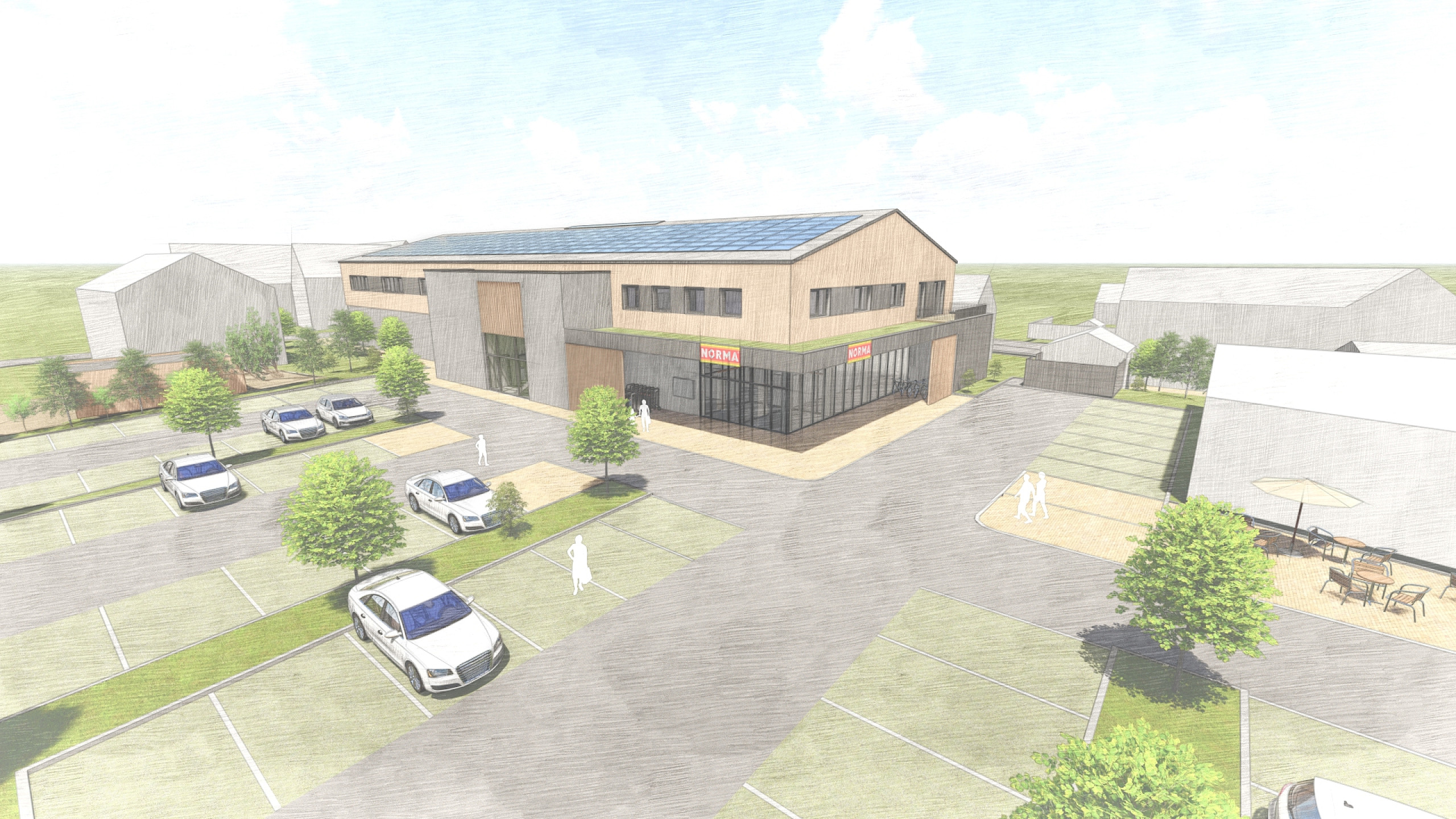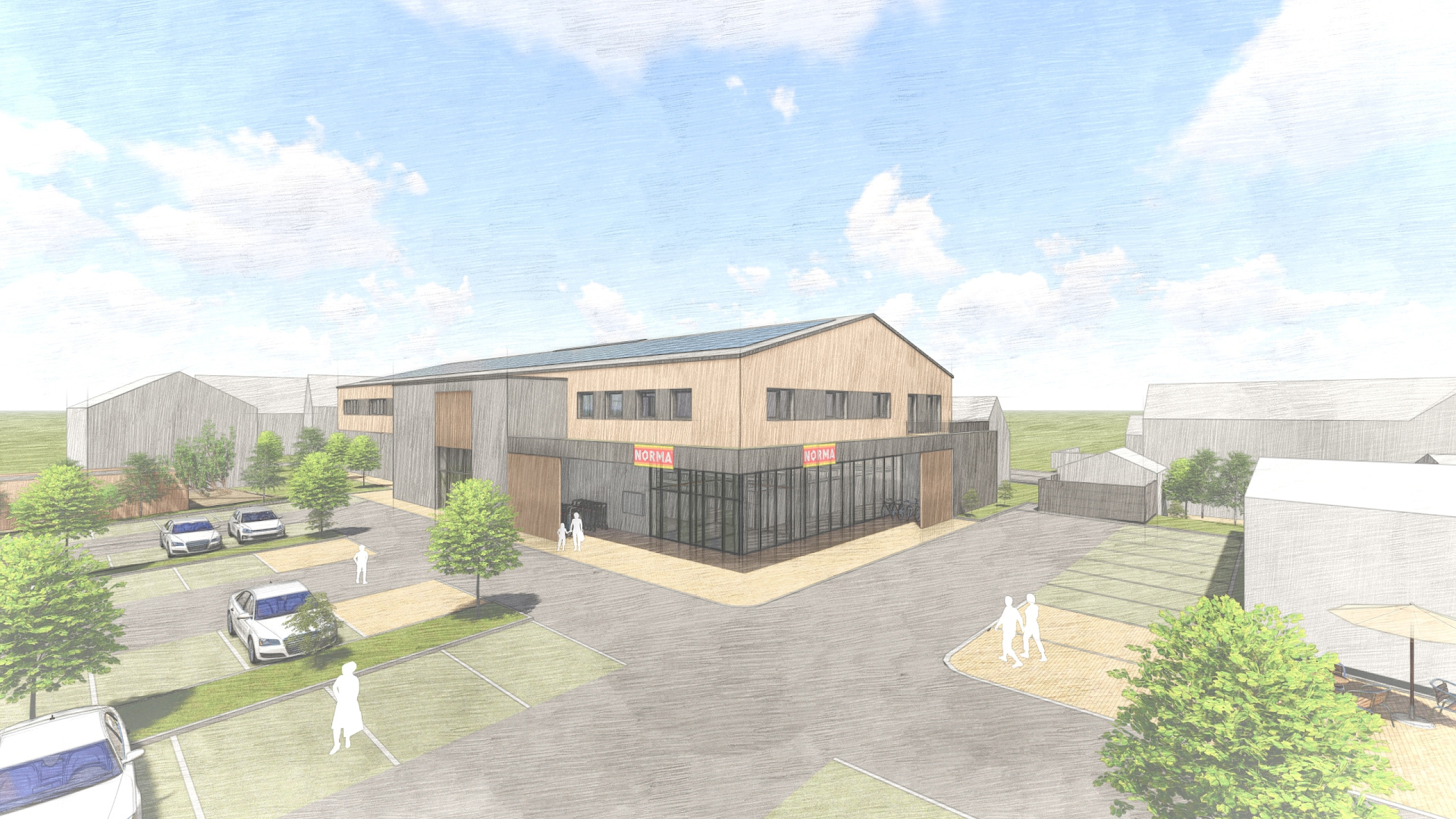 Im Erdgeschoss ist auf 1.200 Quadratmetern ein Norma geplant. Der Vollsortiment-Supermarkt ergänzt das bisherige Angebot in derOrtsmitte von Berkheim. Mit dem neuen Supermarkt im Ortskernverbessert sich das Versorgungsangebot im Herzen der Gemeinde. Die Wild Projektentwicklung GmbH hat sich eng mit lokalen Anbietern, wie bestehender Bäckerei und Metzgerei, dazu abgestimmt. „Der geplante Norma-Supermarkt im Erdgeschoss unseres Neubaus ist eine reine Ergänzung, kein Ersatz zur Metzgerei und Bäckerei um die Ecke“, betont Stefan Geiger.